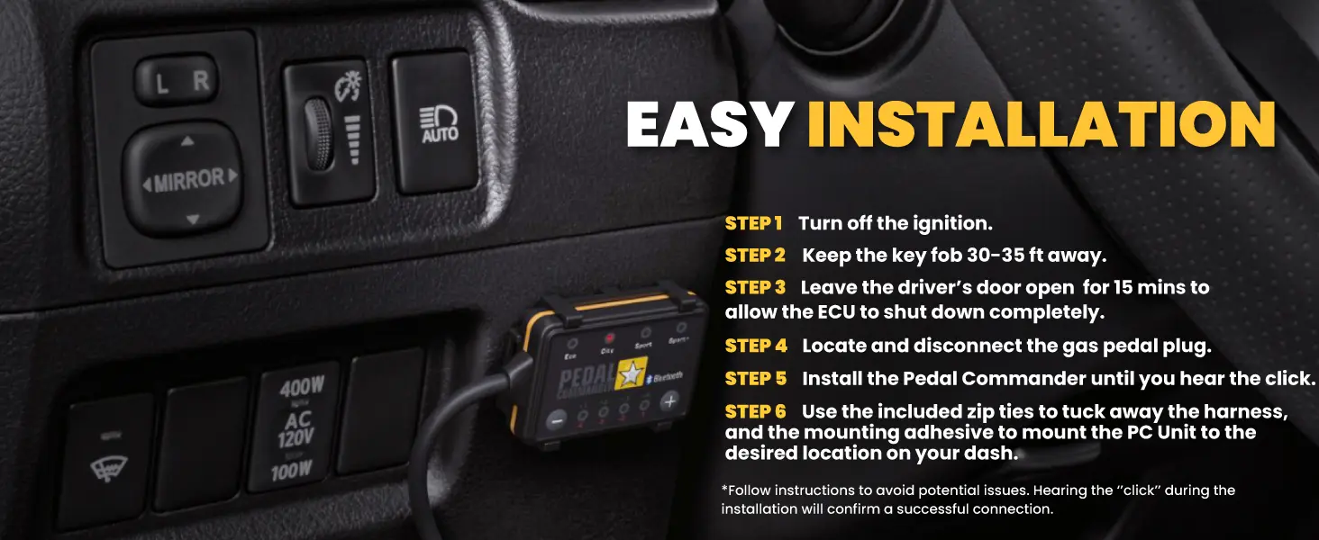 - Quick and Easy Installation: Pedal Commander’s installation process is hassle-free and DIY-friendly. It comes packed with everything you need, and it is mostly a 15-minute job requiring no special tools or cutting or splicing wires.